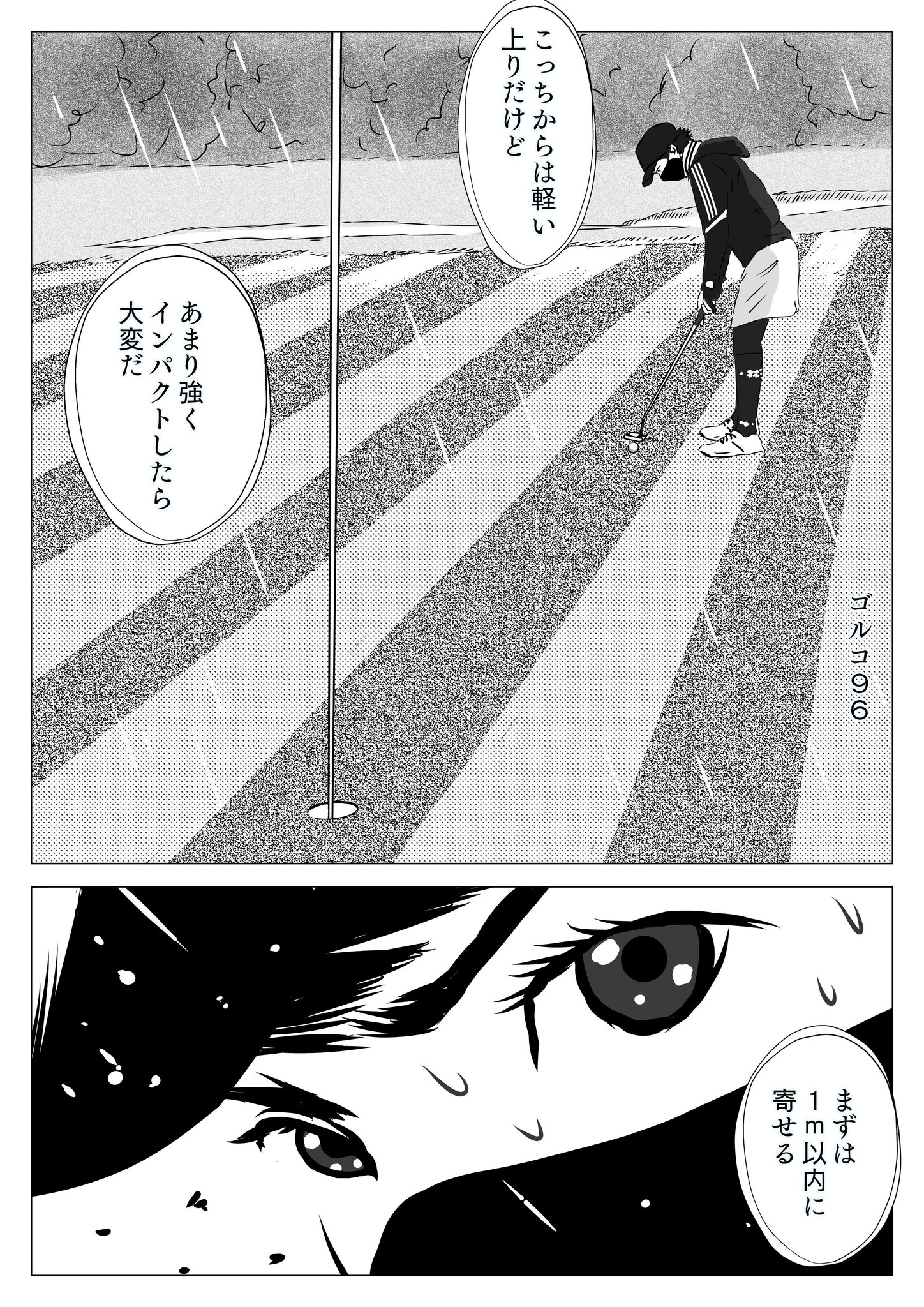 #みんなのゴルフ漫画 埼玉特別編 13ページゴルコ96 さん@HQfsmwdVdFGsleg  パッティングのシーン1ページこれだけ使うと、いつも以上に細かくかけるせいか、少しスケール感が出てくる🐻